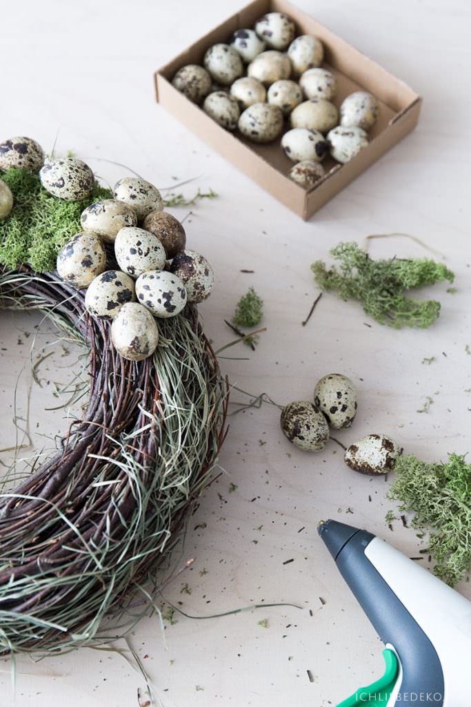 - Dann die Wachteleier mit dem Heißkleber befestigen. Tipp: besonders schön sieht es aus, wenn ein paar vereinzelte Wachteleier noch in das Moos übergehen. Auch schön, wenn manche Wachteleier mit einem leichten Goldhauch überzogen sind.