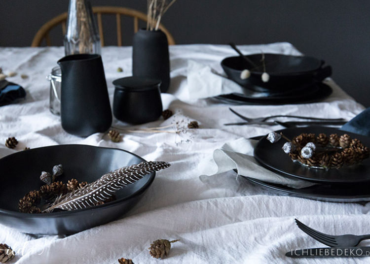 Nach dem Nordic Style habe ich auch diese winterliche Tischdekoration gestaltet – viel Weiß, schwarzes Steingutgeschirr als Kontrast, viel Natur und nicht zu überladen.